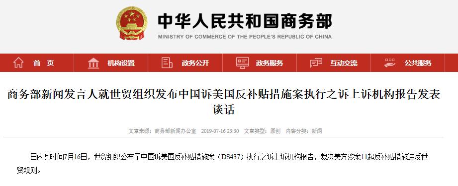 据商务部网站7月16日晚间消息,商务部新闻发言人就世贸组织发布中国诉美国反补贴措施案执行之诉上诉机构报告发表了谈话。